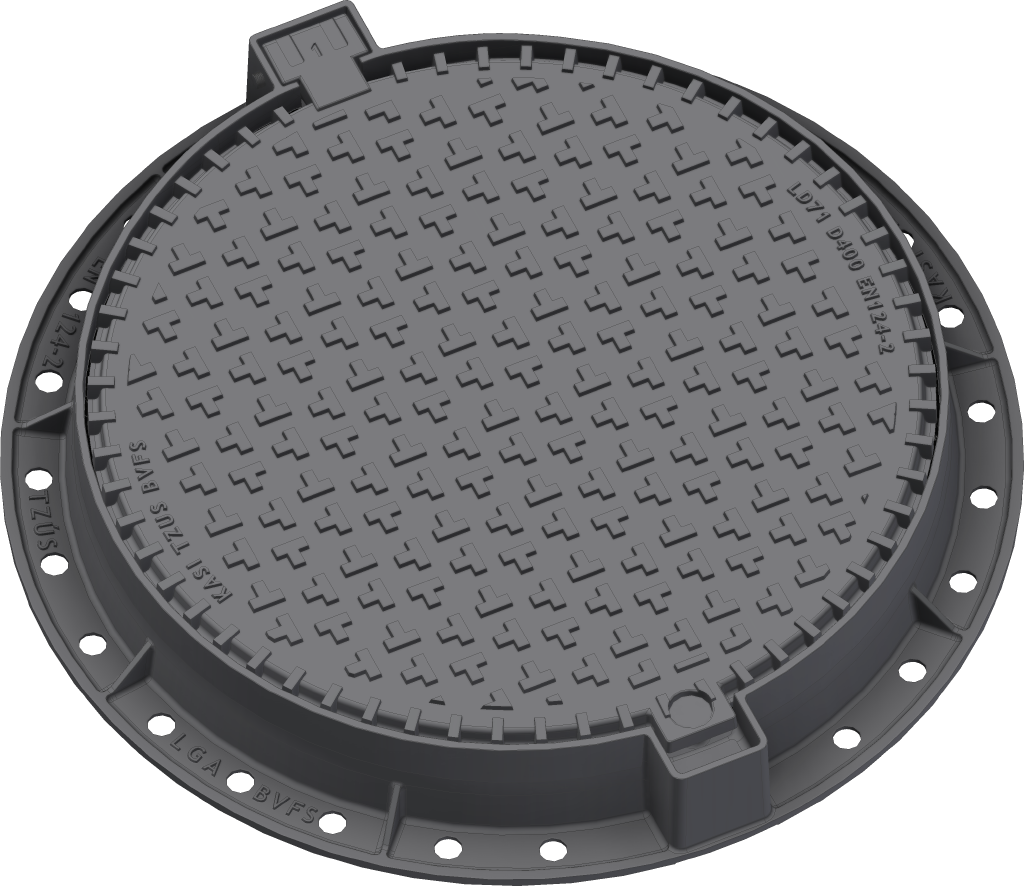 EUROPA 7 Deckel mit Scharnier, Gusseisendeckel ohne Belüftung mit geschlossenem Scharnier, Federverriegelung des Deckels im Rahmen, D400, Gussrahmen mit Fuß H.100mm ohne Aufnahme für Geruchsverschluss, horizontale und vertikale PUR-Dämpfungseinlage am Rahmen