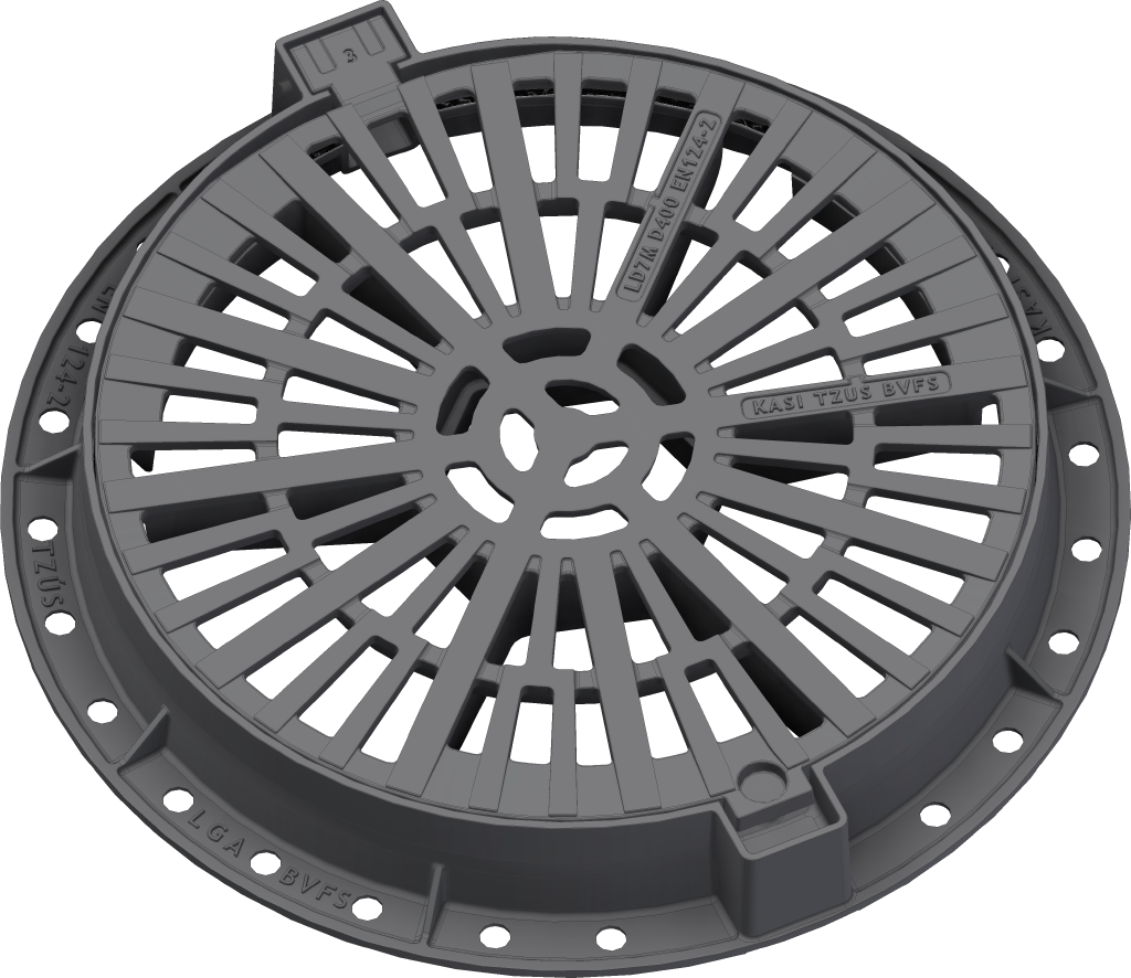 Poklop EUROPA 7 s pantem, víko litina kruhová vtoková mříž s otevřeným pantem, pružinové zajištění víka v rámu, D400, rám litina patkový v.100mm bez osazení pro lapač nečistot, horizontální PUR tlumící vložka na rámu
