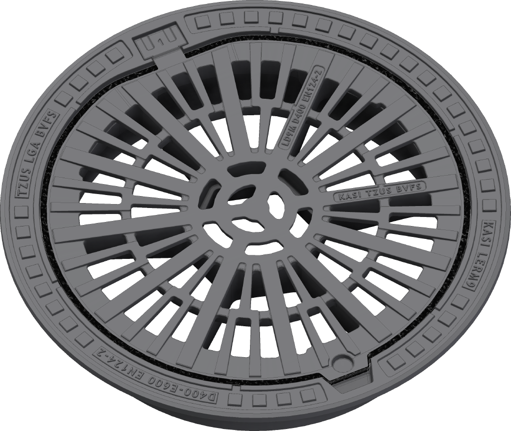 Poklop EUROPA 9 s pantem, víko litina kruhová vtoková mříž s uzavřeným pantem, pružinové zajištění víka v rámu, D400, rám litina samonivelační těžký v.160mm bez osazení pro lapač, horizontální a vertikální PUR tlumící vložka na víku